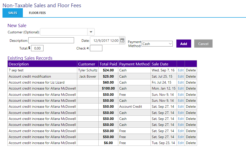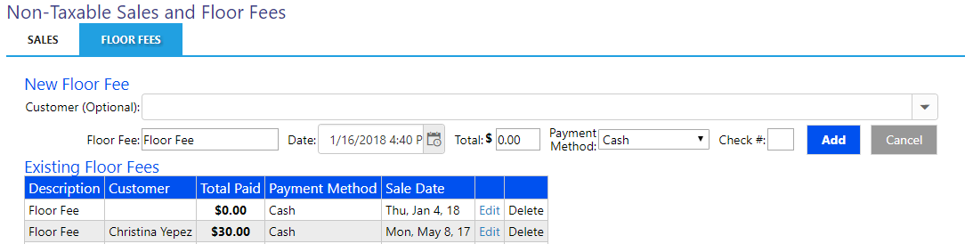 To add a floor fee or other non-taxable sale, go to “Sales” > “Floor Fees and Other Sales”. The following screen will appear.